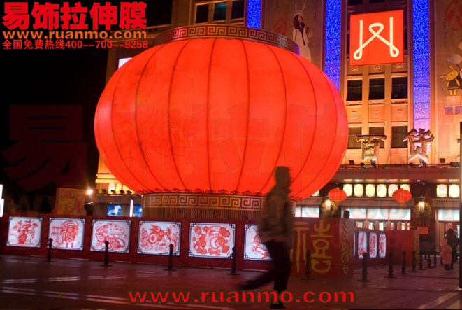 河北蔚縣傳統(tǒng)剪紙十二生肖圖案裝飾,四角還裝飾了“福祿壽喜”藝術(shù)字。“為了制作這個(gè)超大的燈籠,燈籠的面膜采用了柔韌性極強(qiáng)的易飾天天花軟膜,這與傳統(tǒng)紅燈籠的八米緞布料相比,具有阻燃、防水防雪的優(yōu)勢(shì)。”