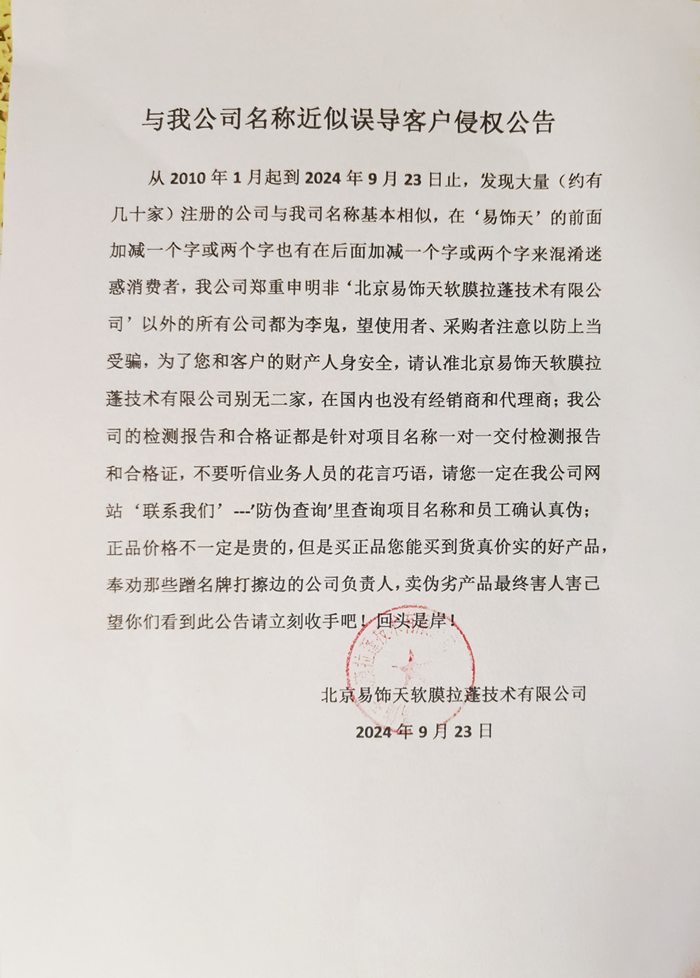易飾天公司世界防火膜的研發(fā)者,所有軟膜安裝結(jié)構(gòu)我們研發(fā)發(fā)明,因為我們技術(shù)創(chuàng)新、所以誠信專業(yè)。